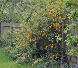 Now the kerria japonica, known for its small, profuse showers of yellow flowers coming to bloom in early spring is a fond sight in many gardens due to its hardy and resilient nature. Requiring regular pruning to keep its many suckers/offshoots from taking over the garden, it is able to withstand cold weather, a little bit of late frost, relatively low maintenance and happy to thrive in the shade in harmony with other plants.